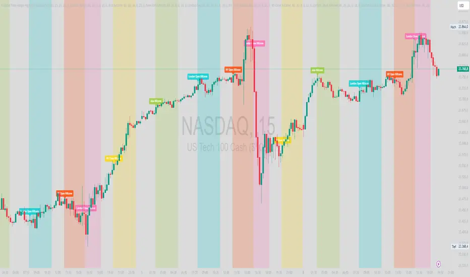 This indicator highlights specific time ranges on your TradingView chart with customizable background colors and labels, making it easier to identify key trading sessions and ICT (Inner Circle Trader) Killzones. It is designed for traders who want to mark important market hours, such as major sessions (Asia, New York, London) or high-volatility Killzones, with full control over activation, timing, colors, and transparency.