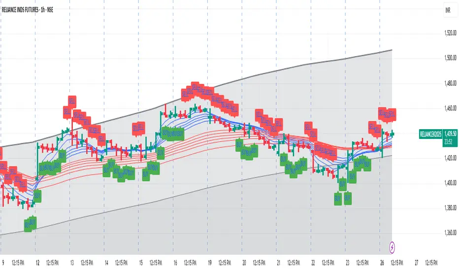 This TradingView indicator combines Guppy Multiple Moving Averages (GMMA) with Bollinger Bands to help you identify trend direction and volatility zones, ideal for spotting pullback entries within trending markets.