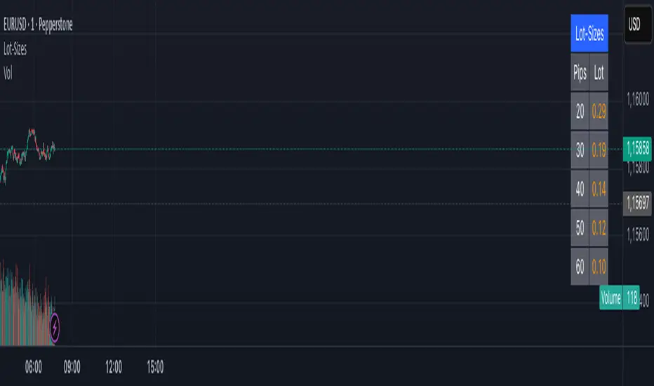This indicator shows, based on your entered risk and account balance, for different pip sizes the lot size, which needs to be entered. The lot size is calculated based on the current market price and the pip-distance to the SL. You can activate/deactivate up to 5 different pip sizes and configure them with own values.
