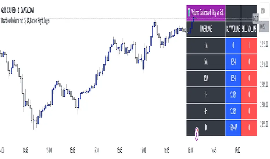 This script displays a multi-timeframe (MTF) volume dashboard, tracking buy and sell volumes and the moving averages of volume. It is designed for traders using ICT (Inner Circle Trader) and SMC (Smart Money Concepts) to quickly visualize market dynamics across multiple timeframes.