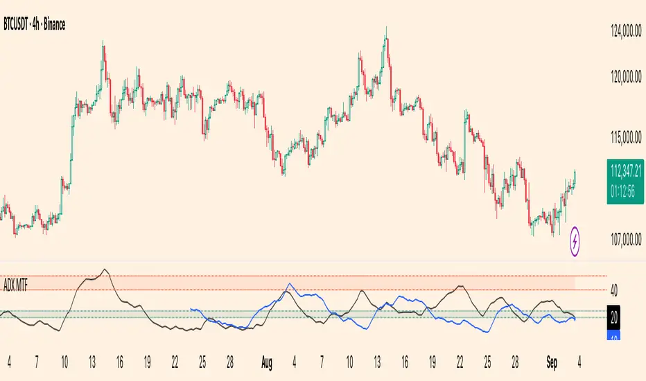 ADX MTF — mura vision measures trend strength and visualizes a higher-timeframe (HTF) ADX on any chart. The current-TF ADX is drawn as a line; the HTF ADX is rendered as “step” segments to reflect closed HTF bars without repainting. Optional soft fills highlight the 20–25 (trend forming) and 40–50 (strong trend) zones.