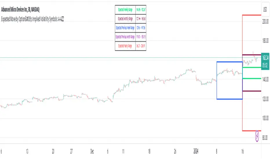 This script plots boxes to reflect weekly, monthly and yearly expected moves based on "At The Money" put and call option's implied volatility.Symbols in range: This script will display Expected Move data for Symbols within the range of A - AZZ in alphabetical order.