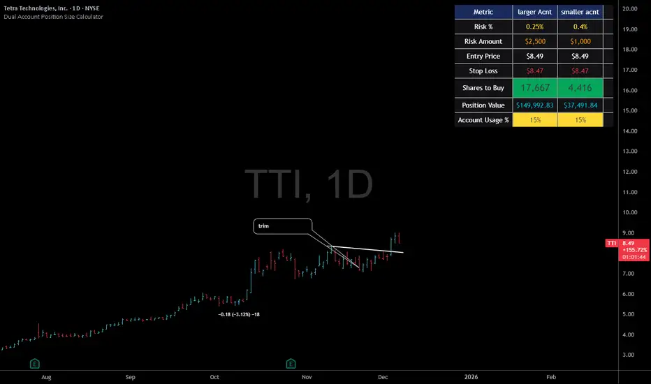 A quick and easy to use position sizing calculator for use on the daily TF only. inputs for two different account sizes and risk %. Calculates risk to low of day (plus a small buffer which can be changed based on ATR). Shows # of shares to buy, stop loss, portfolio %.