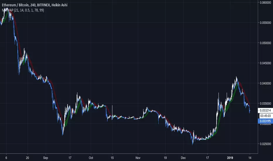 This method uses MVWAP to identify longer term trends. Suitable for 30m to 3d timeframes, recommended for 4h or 1d.