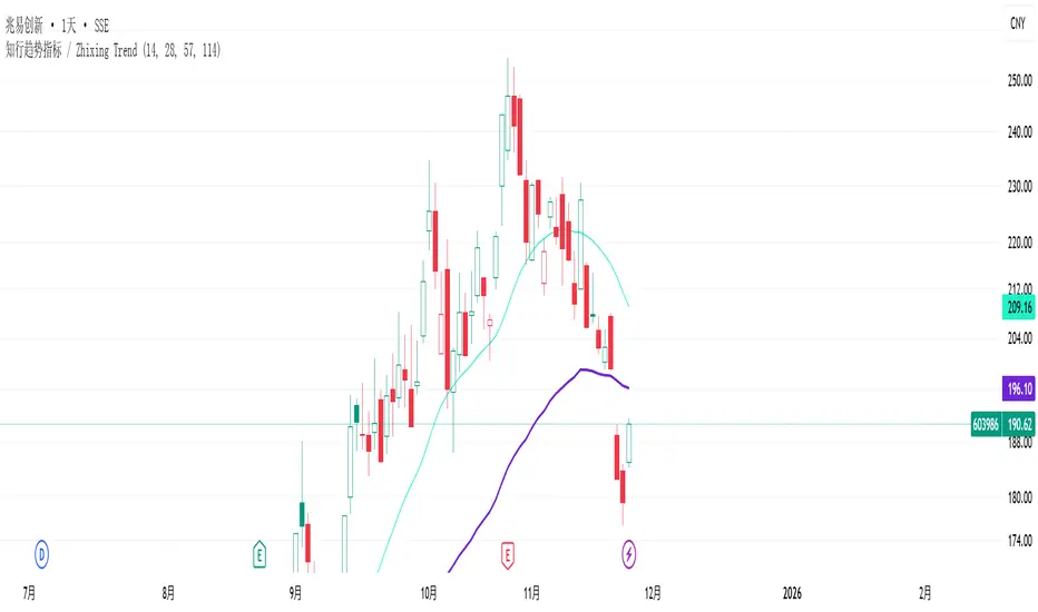 The Zhixing Trend Indicator is a trend-following tool based on multiple moving averages. It combines short-term EMA with multi-period SMA to identify both short-term and medium-to-long-term market trends.