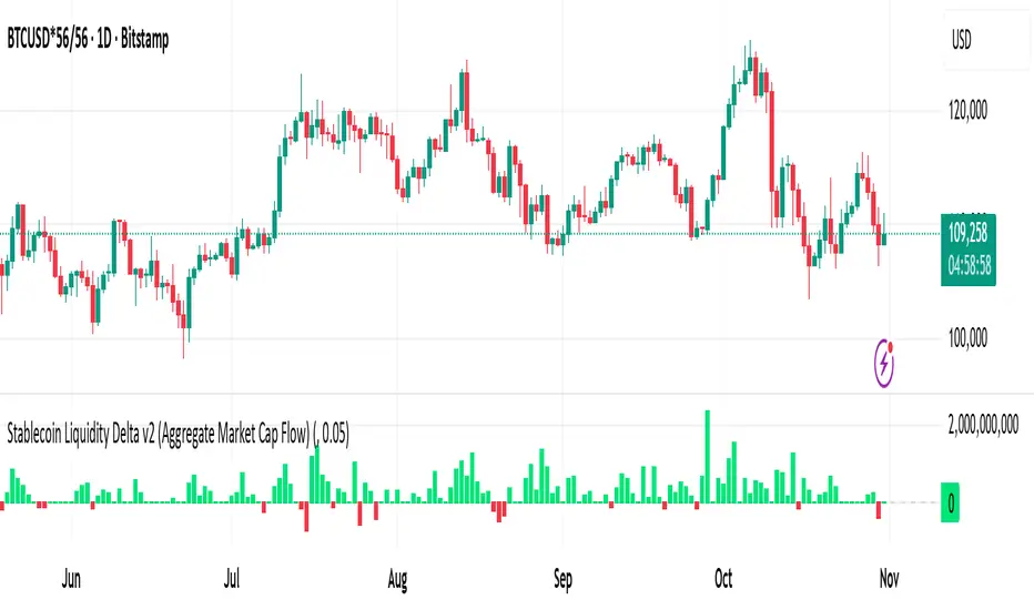 This indicator visualizes the bar-to-bar change in the aggregate market capitalization of major stablecoins, including USDT, USDC, DAI, and others. It serves as a proxy for monitoring on-chain liquidity and measuring capital inflows or outflows across the crypto market.