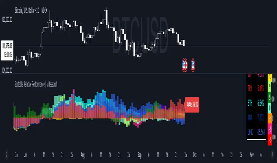 The Sortable Relative Performance indicator by viResearch delivers a clean and effective way to measure and rank asset performance over time. By combining visual clarity with real-time calculation and dynamic sorting, it offers a powerful lens through which traders can evaluate market leadership and laggard behavior. Its flexibility and modular design ensure it can be integrated into a wide range of strategies and trading styles. Whether you're managing a crypto portfolio or monitoring traditional markets, this tool provides essential insights into where momentum resides and how capital is flowing across assets.