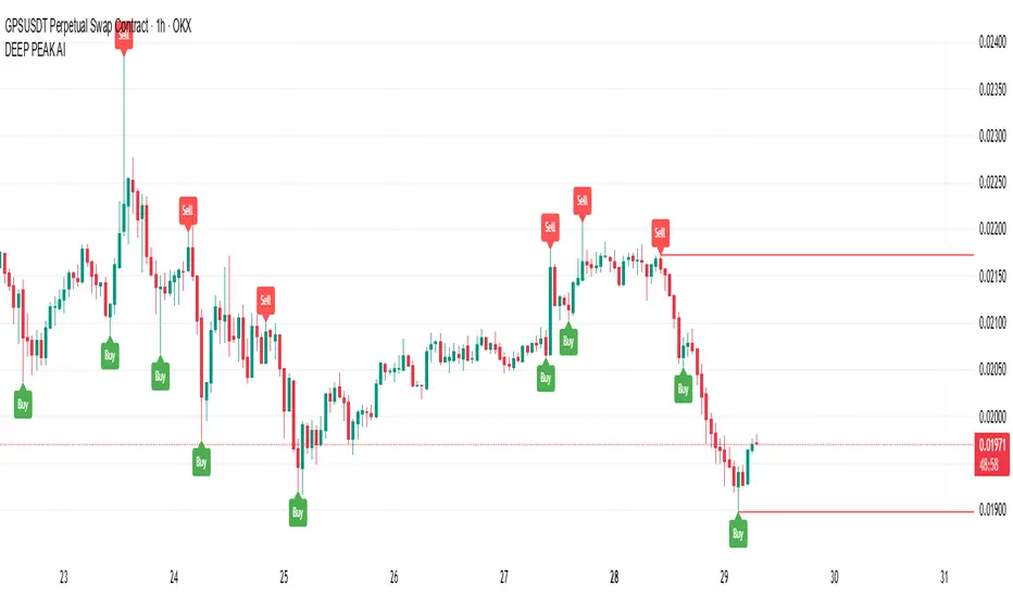DeepPeak AI is a smart technical analysis indicator powered by artificial intelligence (AI). It identifies potential peak and bottom zones on price charts and provides timely buy-the-dip and sell-the-peak signals.