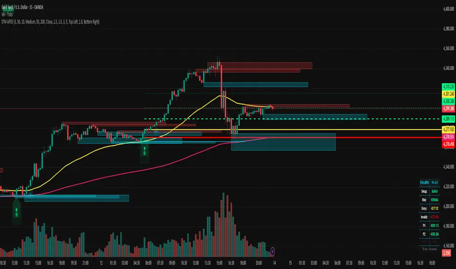 **STM APEX Pro** is a comprehensive technical analysis tool designed for modern traders who require precision on both desktop and mobile devices. This script combines **Smart Money Concepts (SMC)**, **Trend Structure**, and **Volatility Modeling** to assist traders in identifying high-probability market contexts without chart clutter.