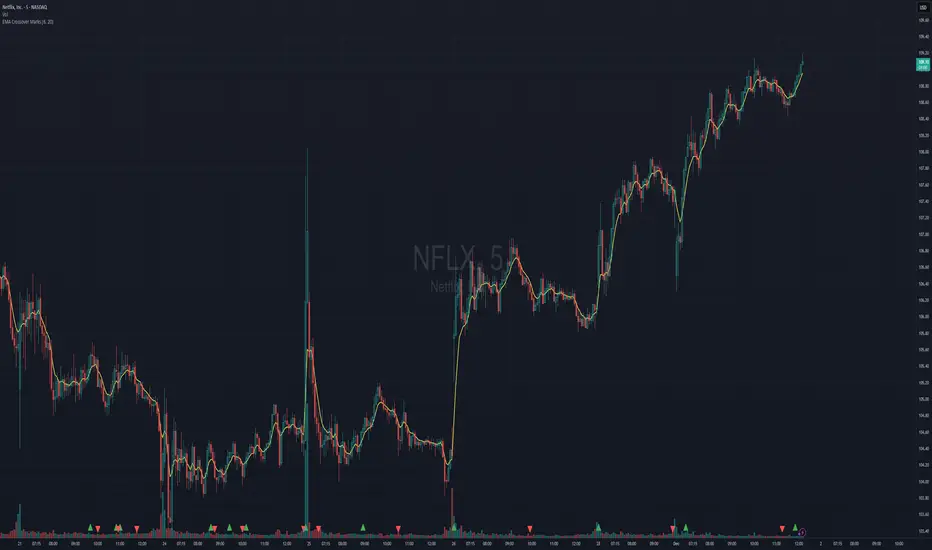 Puts a green arrow or red arrow at the bottom of the chart when the 6 period EMA crosses above (or below) the 20 period EMA.