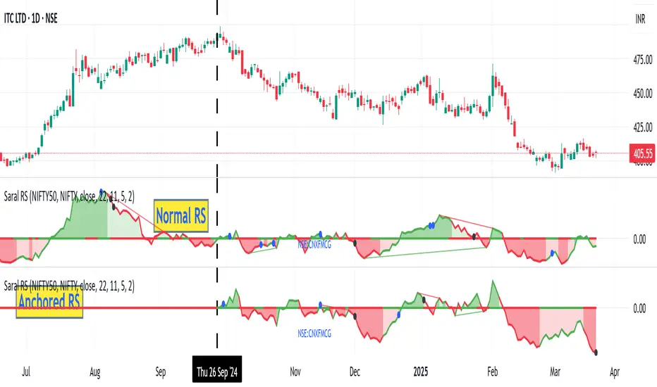 - Anchored RS (ARS):The calculation starts from a user-defined anchor date and extends indefinitely, incorporating all price movements since that point. This makes ARS particularly useful for analyzing performance from key market events, such as major trend reversals. - New Inputs related to ARS: