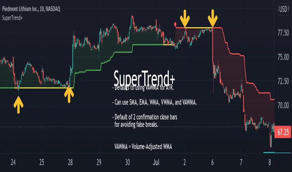 - Defaults to using Volume-Adjusted WMA (VAWMA) for ATR. (Can still be configured to behave exactly like classic SuperTrend.)