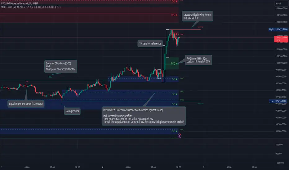 Inspired and initially based on LuxAlgo's Smart Money Concepts Indicator I created a library lib_smc that started to convert every function and return objects. This allowed certain customizations like tracking the current fill level of FVGs or tracking the creation of Order Blocks, by monitoring consecutive bars against the current trend.