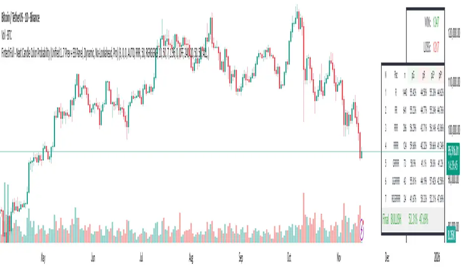 This indicator estimates the probability that the next candle will close green or red, using recent R/G color patterns of depth N = 1..7.