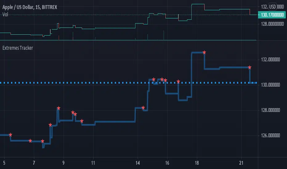 The close graph is plotted (func. plot) and the points of extremes (func. pivothigh and pivotlow) are marked on it (func. plotchar)