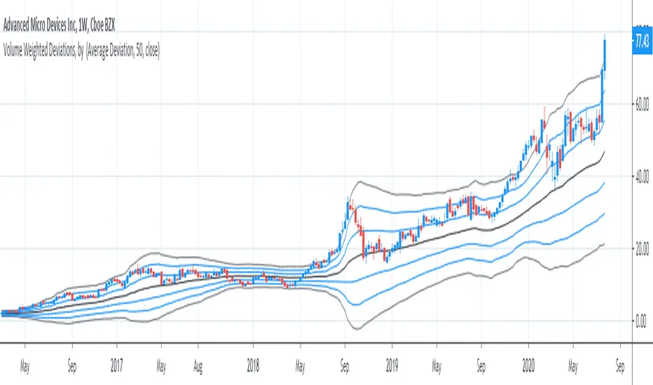Important: I don't really know how people generally compute deviations from VWAP/VWMA, but smth tells me generally it's just a Av Dev/St Dev based on mean, not on appropriate basis, like volume weighted mean in our case. This version is mathematically correct, it first calculates weighted mean, than utilizes this weighted in mean in AvDev & StDef functions modified to take into account weights.