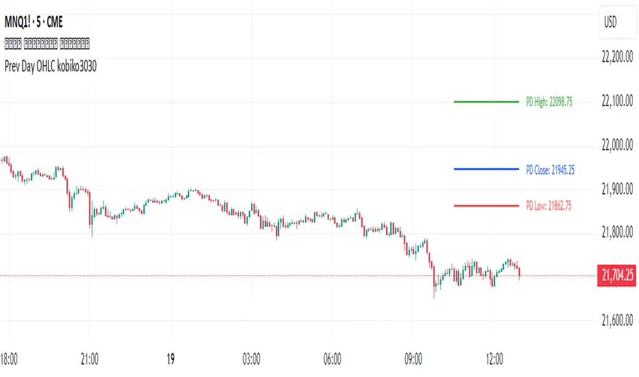 This professional TradingView indicator displays the previous day's key price levels (Open, High, Low, Close, and 50% midpoint) as horizontal lines on your chart. These levels are essential for traders who use previous day data as support and resistance zones in their technical analysis.