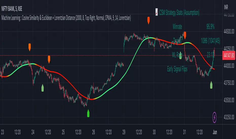 Market Analysis: The script utilizes advanced machine learning methods such as Lorentzian, Euclidean distance, and Cosine similarity to analyse market conditions. These techniques measure the similarity and distance between data points, enabling more precise signal identification and enhancing trading decisions.
