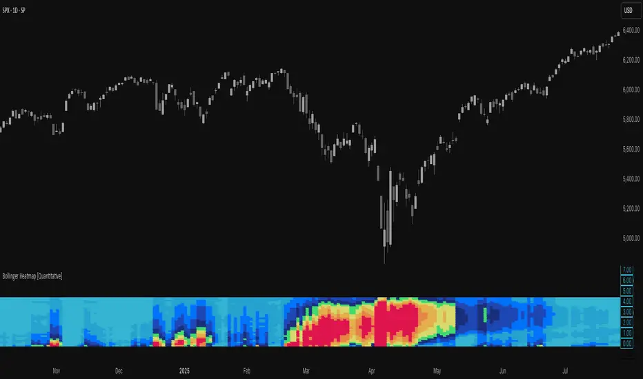 The algorithm quantifies the current price’s relative position within each Bollinger band ensemble, generating a normalized position ratio. This ratio is subsequently transformed into a scalar heat value, which is then rendered on a continuous color gradient from red to blue. Red hues correspond to price proximity to or extension below the lower band, while blue hues denote price proximity to or extension above the upper band.