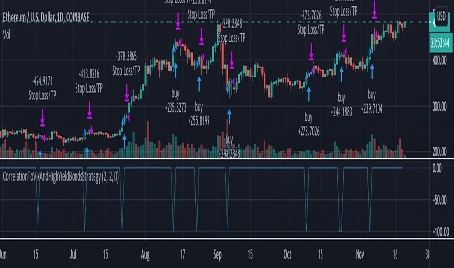 This strategy measures and creates a signal when an asset is moving out of a correlation with high yield bonds or the CBOE VIX into an inverse correlation, as well as when an asset is losing correlation with a top corporate bonds ETF. When this signal is triggered, the simulation has the portfolio asset go long.