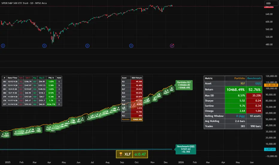 This indicator provides a complete portfolio management solution for traders seeking to maximize returns through systematic asset rotation while maintaining full transparency with comprehensive performance metrics, trade history, and visual feedback.