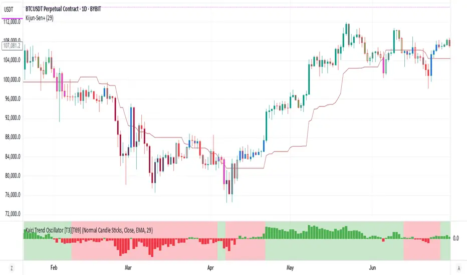 The Kairi Trend Oscillator [T3][T69] is a Japanese-inspired hybrid oscillator combining Heikin-Ashi trend clarity with the Kairi (乖離率) indicator — a measure of price deviation from a moving average. This dual-layer system gives you both trend direction and trend strength/health, designed to highlight trend maturity and avoid overextended entries.