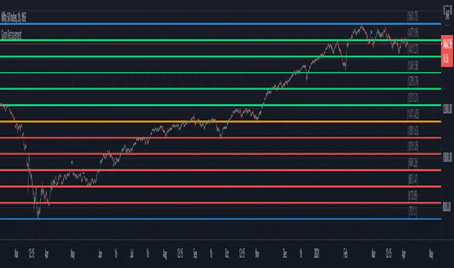 The indicator generates Gann retracement levels between any two significant price points, such as a high and a low.