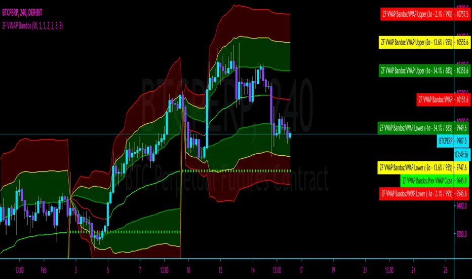 Updated Colors based on Standard Deviations, Deviation Labels/Percentages, and fixed "Previous VWAP Close" Plot.Green = 1σ = 34.1%