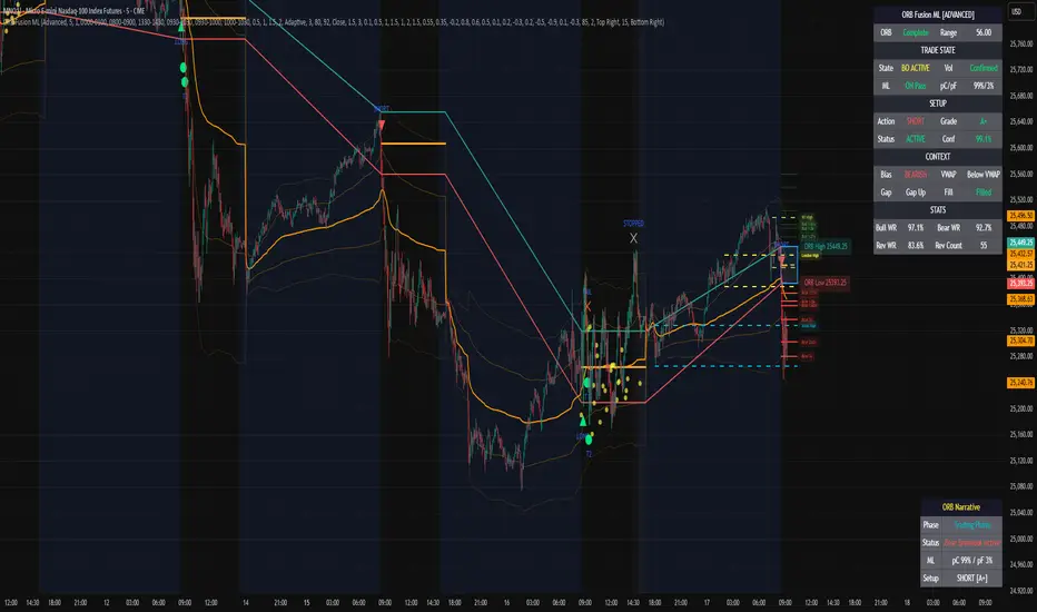 ORB Fusion ML is an advanced Opening Range Breakout (ORB) system that combines traditional ORB methodology with machine learning probability scoring and adaptive reversal trading. Unlike basic ORB indicators, this system features intelligent breakout filtering, failed breakout detection, and complete trade lifecycle management with real-time visual feedback.