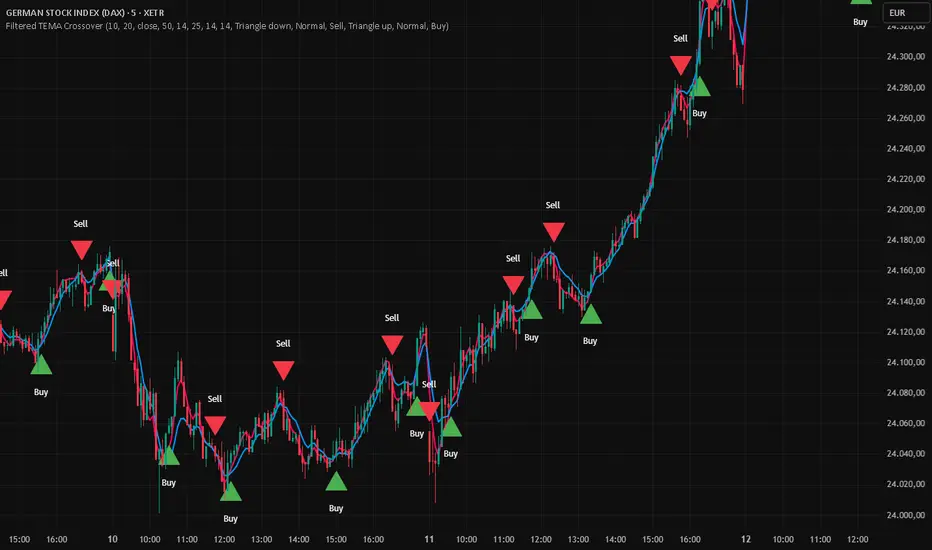 This indicator is a trend-following tool based on the classic Dual Triple Exponential Moving Average (TEMA) Crossover strategy, enhanced with two robust filters: the Chop Index and the Average Directional Index (ADX).