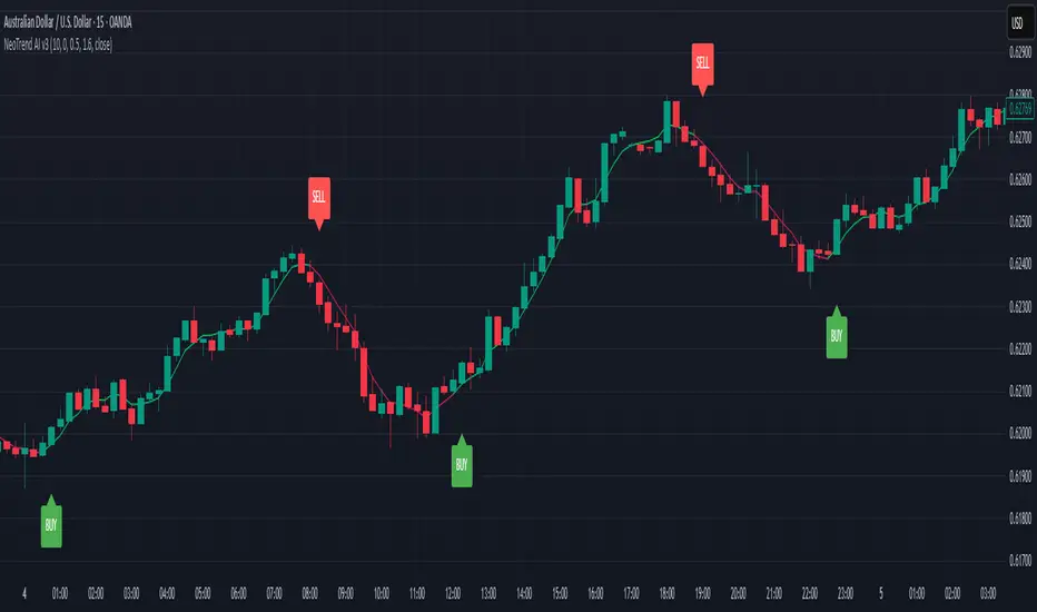 NeoTrend AI is an advanced trading signal indicator that uniquely integrates a kernel-based predictive model with adaptive volatility analysis. By processing historical price data through a Gaussian kernel matrix, NeoTrend AI produces a statistically informed predicted price. This prediction is then used to generate dynamic volatility bands that serve as adaptive support and resistance levels, leading to clear BUY and SELL signals.