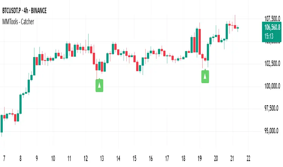 Catcher is a professional trading indicator designed to provide insightful, high-quality purchasing signals to traders, algorithmic traders, and investors. The indicator employs trend-following, momentum, and volatility-based techniques, all integrated into the author's unique and sophisticated strategic framework. This approach ensures that only the highest-performing signals are selected and presented. Unlike the majority of indicators, Catcher seeks to deliver signals against local price movements. Furthermore, the indicator is engineered to adapt to changing market conditions, ensuring its sustained value and relevance.
