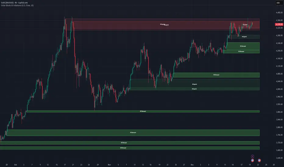 - Demand Zones (Green): Potential long entry areas when price returns. Expect buying pressure to defend these levels. Best setups when price retests an active (non-mitigated) zone.