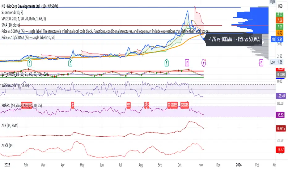 This TradingView script shows how far the current price is from its 10-day and 50-day moving averages (DMAs), expressed as percentages, and displays both values as a single label near the latest candle — for example, “+3% vs 10DMA | +8% vs 50DMA.” You can switch between simple and exponential moving averages using the “Use EMA” checkbox, and adjust the period lengths in the input panel. To use it, simply copy the code into TradingView’s Pine Editor, click Add to chart, and you’ll see one live label updating each bar along with the plotted 10- and 50-day average lines.