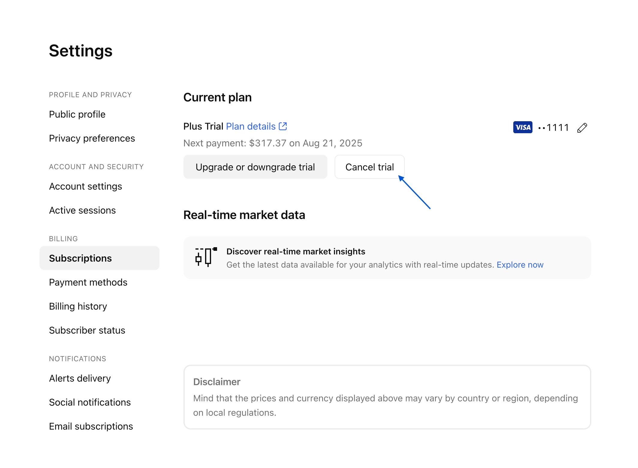 무료 체험판은 한 번의 클릭으로 취소할 수 있습니다. 이를 위해 설정 및 결제 → 구독 → 체험판 취소로 이동하세요.