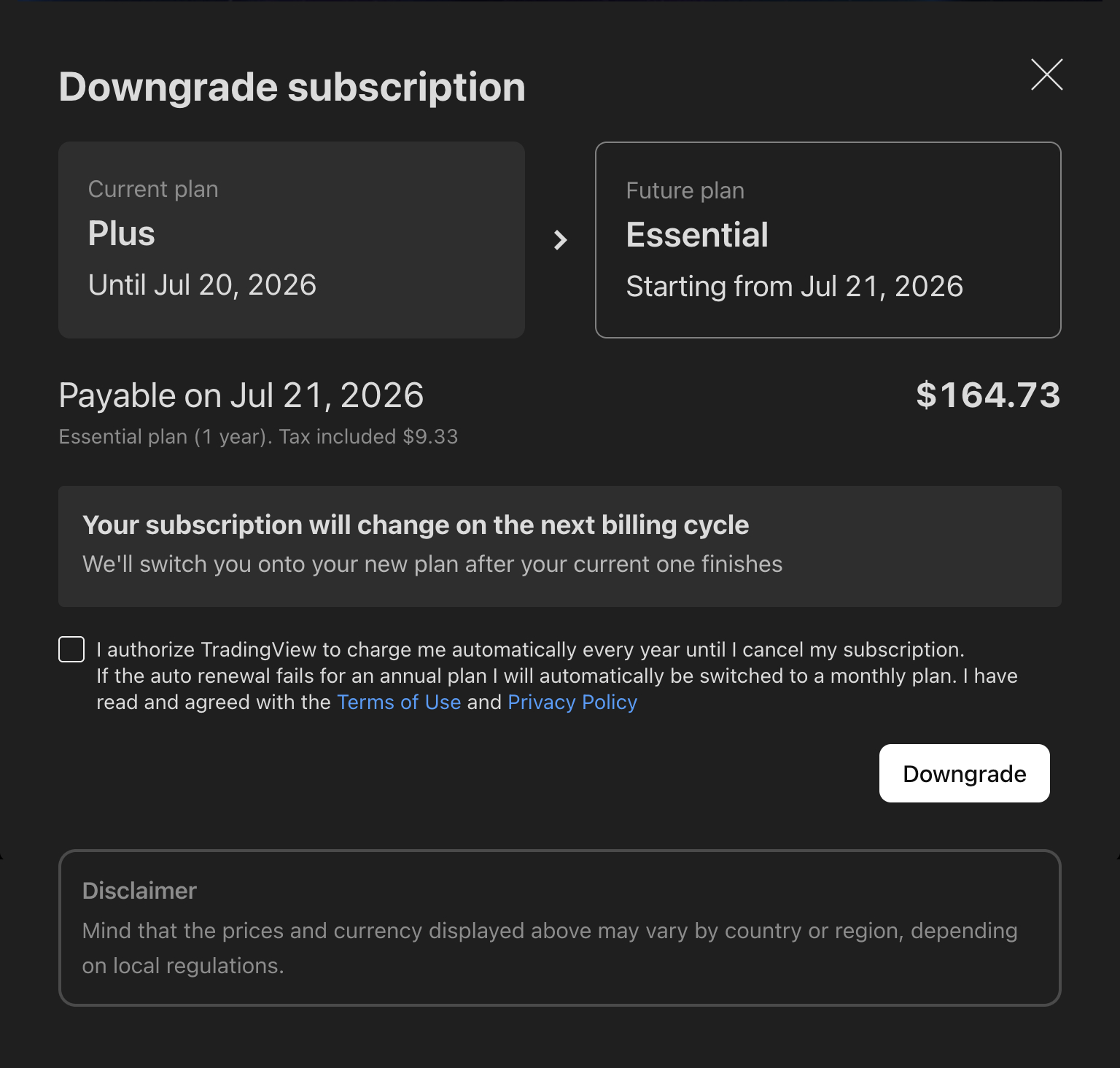 현재 플랜을 다운그레이드하고 싶다면 프라이싱 페이지에서 새 플랜을 고를 수 있습니다. 현재 섭스크립션이 끝나면 새 플랜이 액티베이트되어 그에 따라 알맞게 차지가 됩니다.