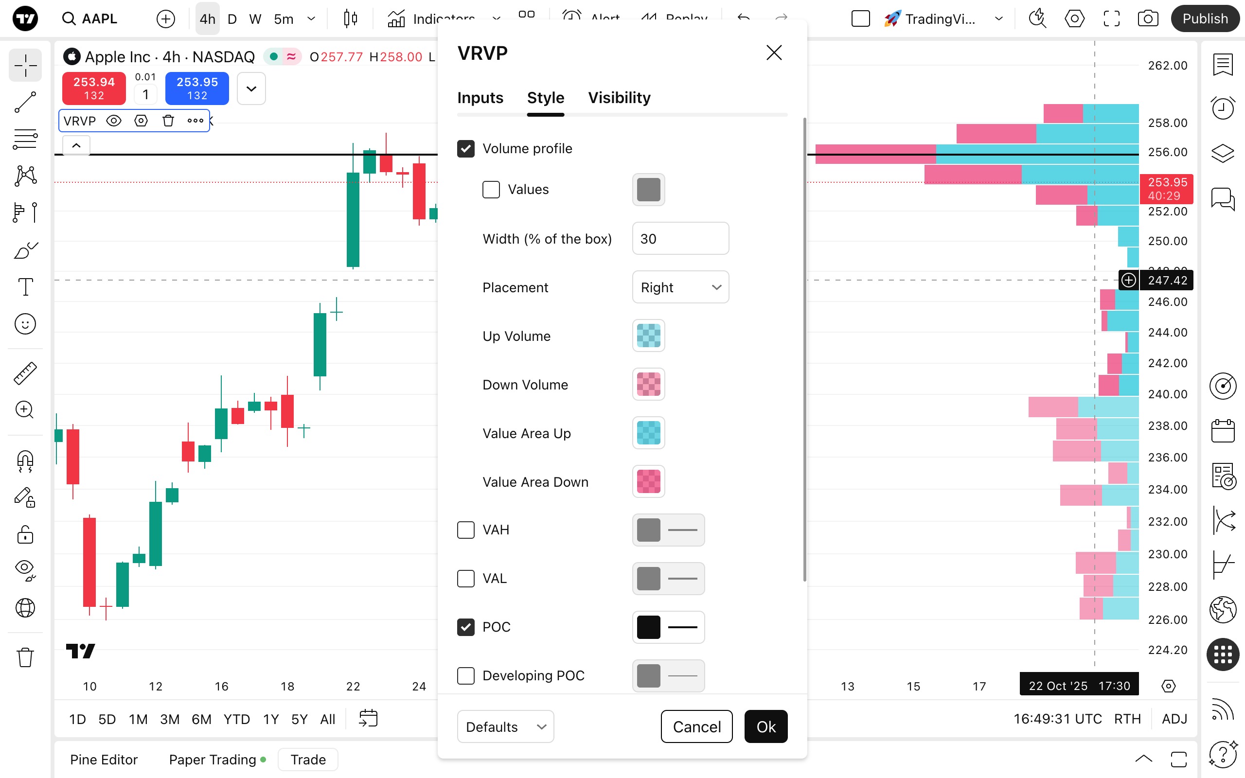 매수/매도 거래량 대신 상승/하락 거래량을 사용하고, 바 내의 가격 방향에 따라 VP를 계산합니다. 종가가 시가보다 크면 상승 거래량으로, 종가가 시가보다 작으면 하락 거래량으로 간주합니다.