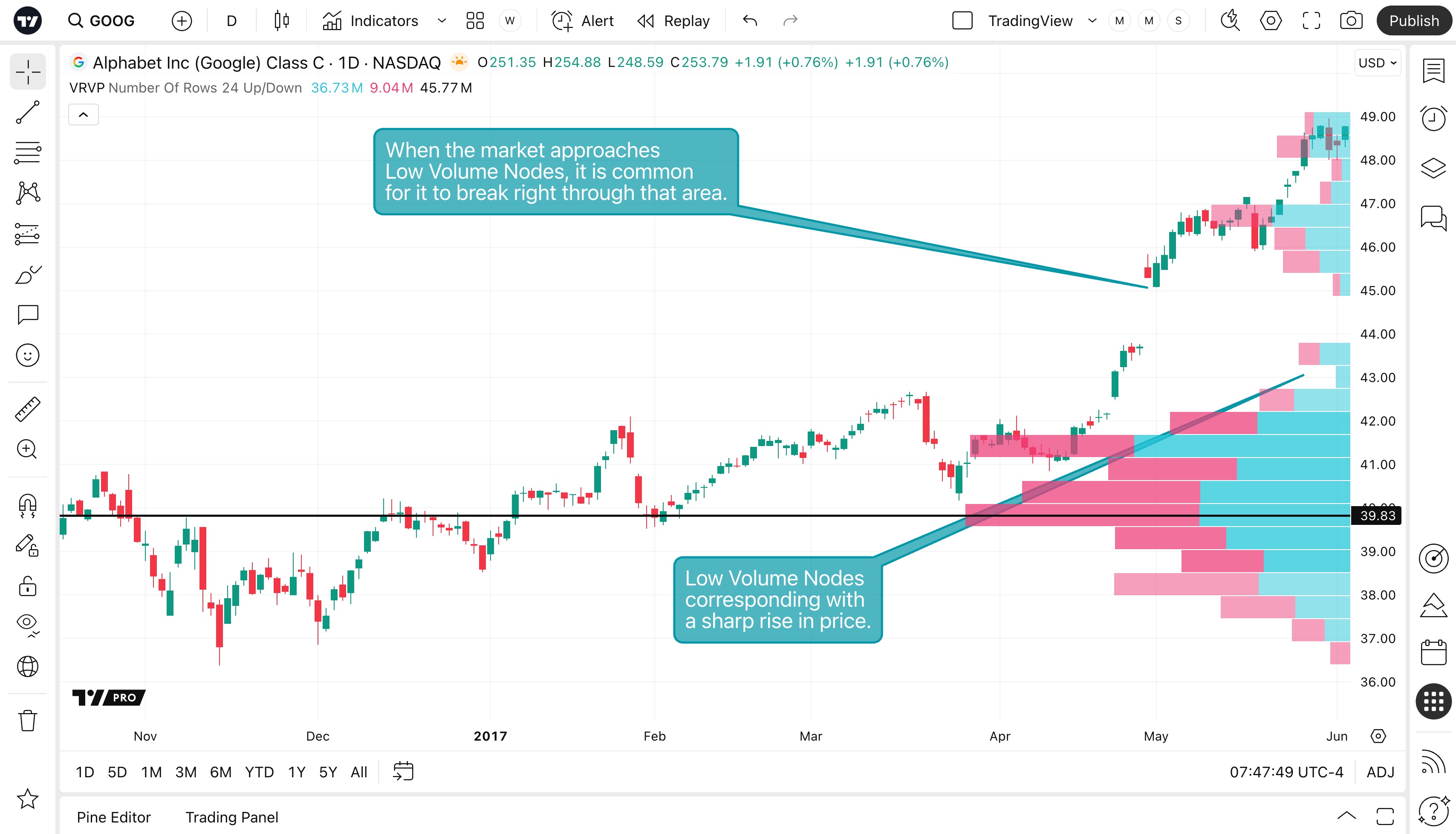 저거래량 노드(LVN)는 그 반대입니다. 거래량이 크게 감소한 골짜기 부분입니다. 이 노드는 일반적으로 가격이 특정 레벨을 빠르게 돌파하거나 하락할 때 형성됩니다. 이것을 시장이 머물고 싶지 않은 “불공정한 가치 영역”으로 볼 수 있습니다.