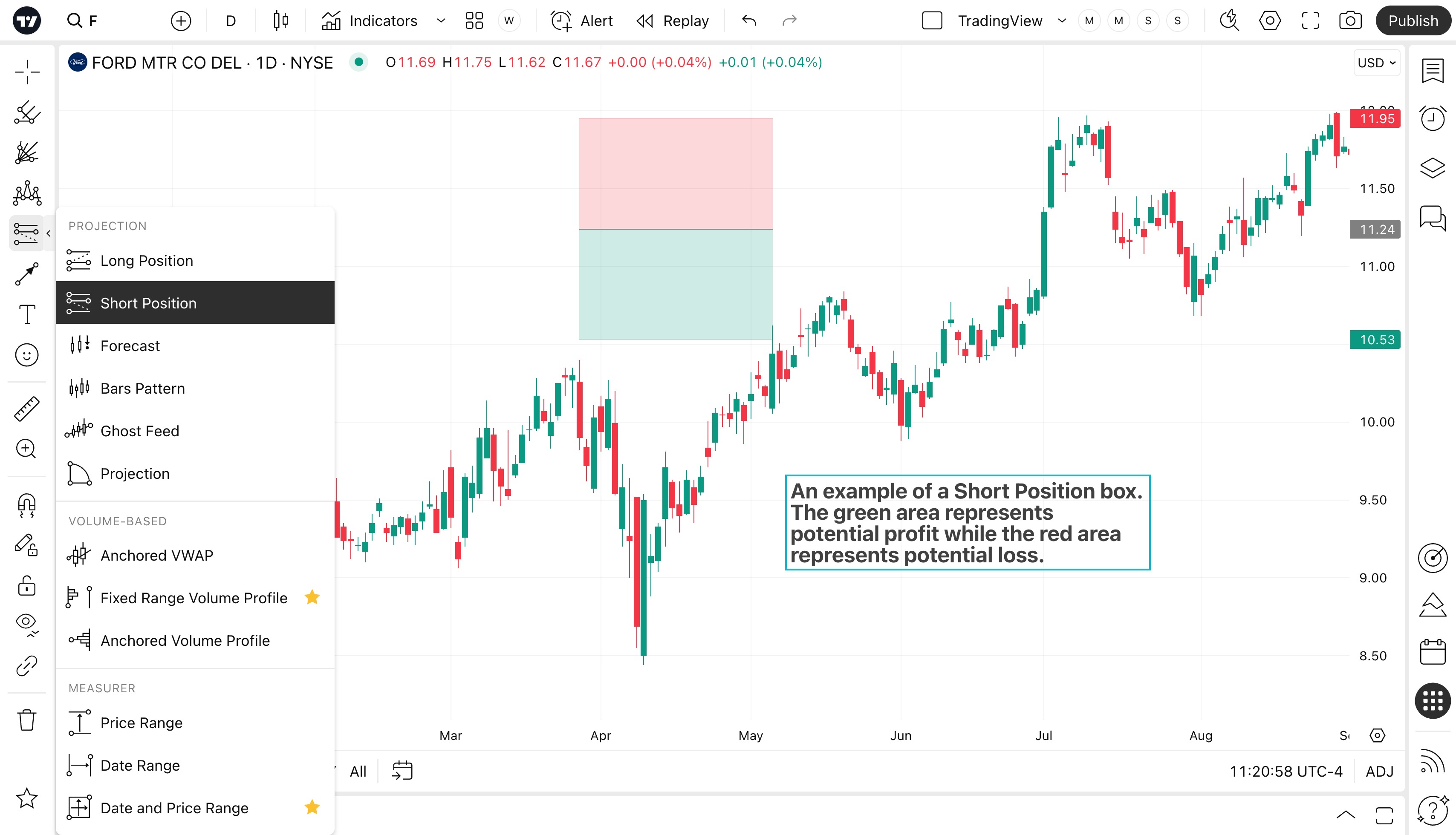 숏 포지션 도구를 사용하면 진입점을 설정하고 해당 지점에서 숏 포지션을 취할 수 있습니다. 해당 가격 수준 위와 아래로 확장하면 두 개의 상자가 됩니다. 이익 영역은 녹색이고 손실 영역은 빨간색입니다. 두 영역 모두 사용자가 수동으로 조정하여 위험/보상 비율을 변경할 수 있습니다.