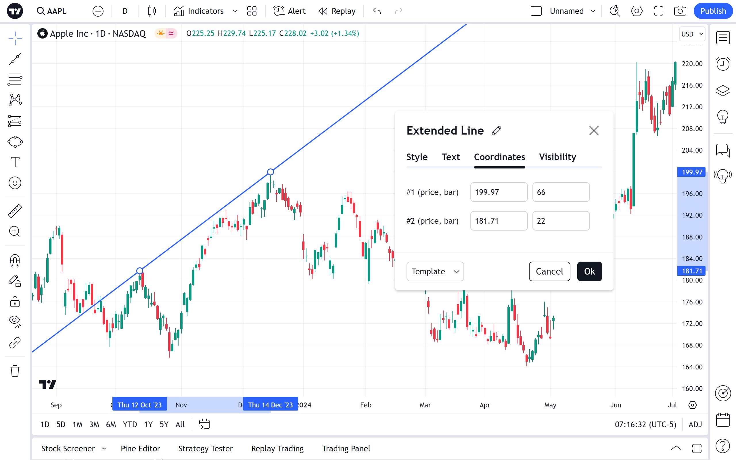 좌표 속성 대화 상자에서 가격 눈금(가격을 설정하여)과 시간 눈금(바 번호를 설정하여)에서 확장된 선의 끝점 위치를 정확하게 설정할 수 있습니다: