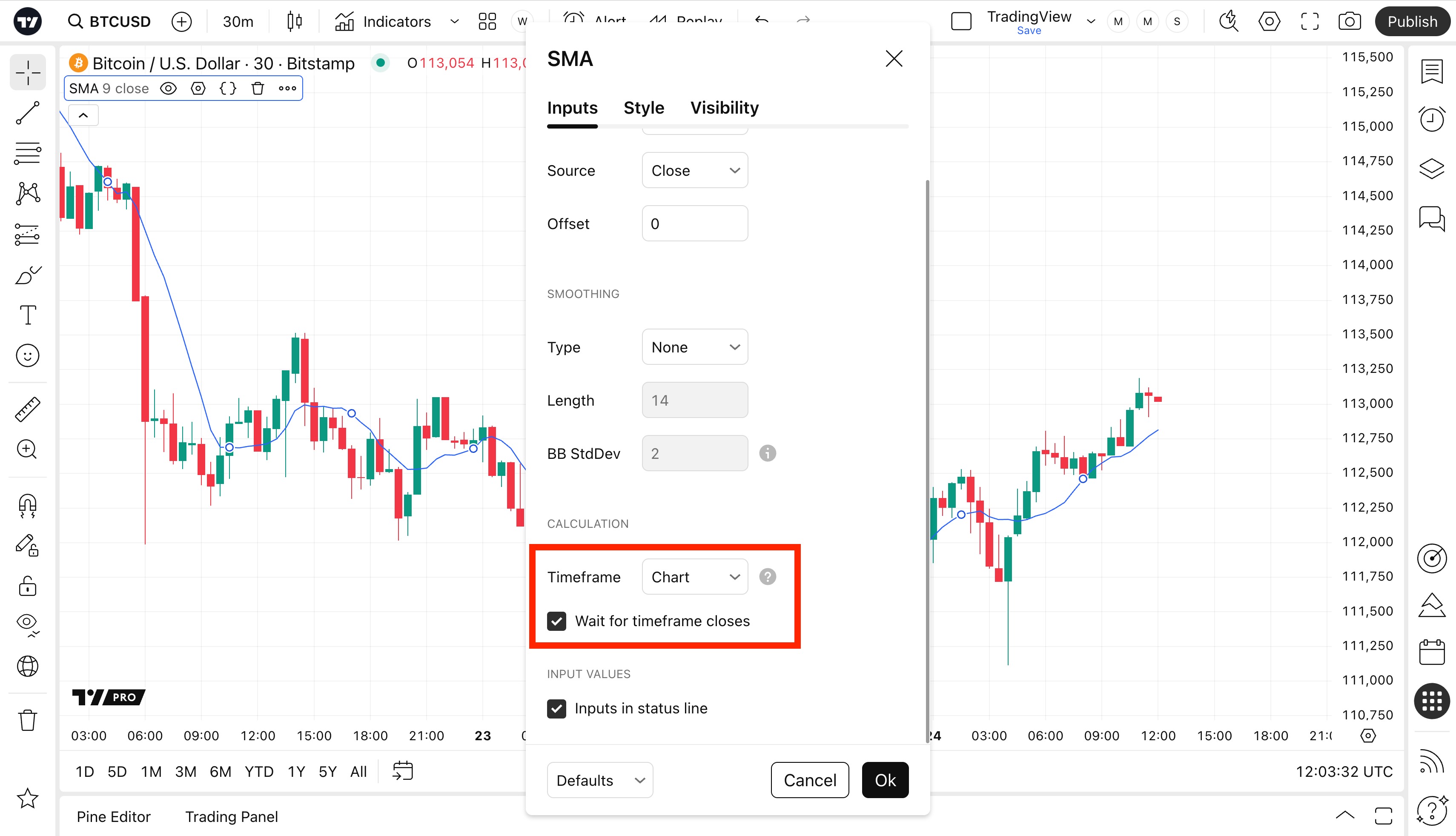 빌트인 인디케이터 중 다수는 MTF(다중 타임프레임) 기능을 지원합니다. 해당 기능이 적용된 경우, 스크립트의 “설정/입력값” 탭에 ‘계산’ 섹션이 표시되며, 여기에는 “타임프레임” 드롭다운 메뉴가 있습니다. 이 메뉴에서 해당 인디케이터의 계산에 사용할 타임프레임을 선택할 수 있습니다. 이를 통해 예를 들어 1시간 차트를 보면서 동시에 데일리 이동평균을 확인할 수 있습니다.