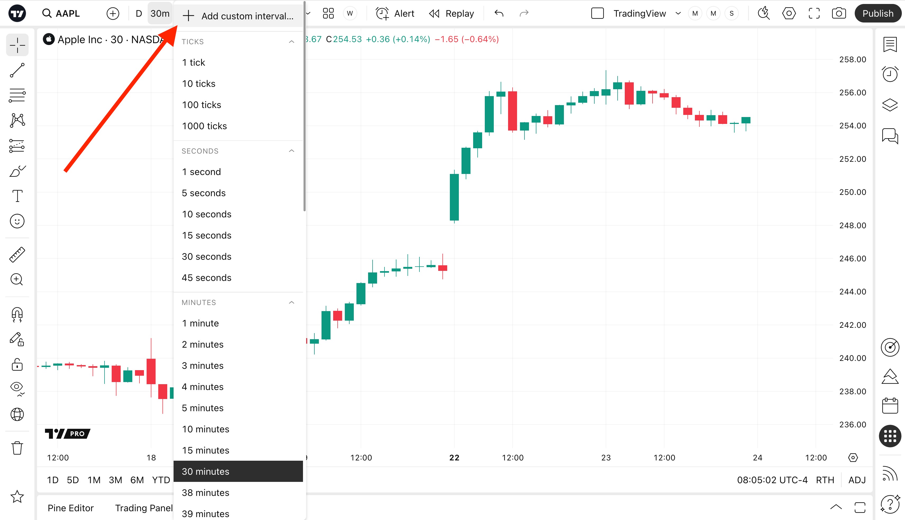 “타임프레임” 드롭다운에 새 타임프레임을 추가하려면 차트 페이지의 메인 “타임 인터벌” 드롭다운 메뉴에 해당 타임프레임을 추가하면 됩니다. 커스텀 타임프레임 목록은 두 메뉴 간에 공유됩니다.