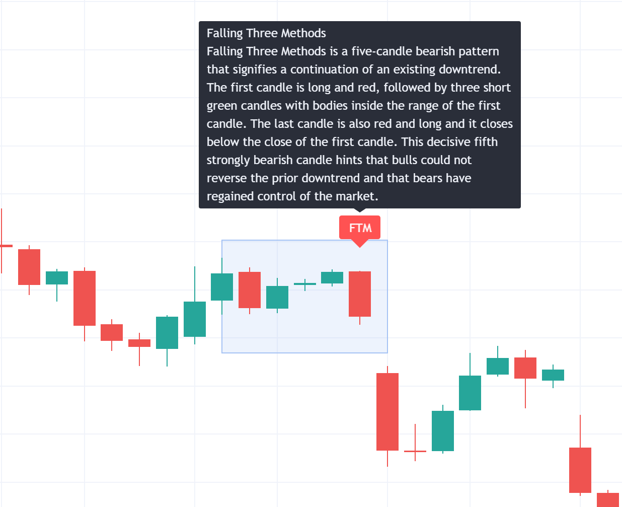 폴링 쓰리 메소드는 기존 하락 추세의 지속을 나타내는 5캔들 약세 패턴입니다. 첫 번째 캔들은 길고 빨간색이며, 몸통이 첫 번째 캔들의 범위 안에 있는 세 개의 짧은 녹색 캔들이 이어집니다. 마지막 캔들 역시 빨간색이고 길며 첫 번째 캔들 종가 아래에서 마감합니다. 이 결정적인 다섯 번째 강한 약세 캔들은 상승세가 이전 하락 추세를 반전시키지 못하고 하락세가 시장 주도권을 되찾았음을 암시합니다.