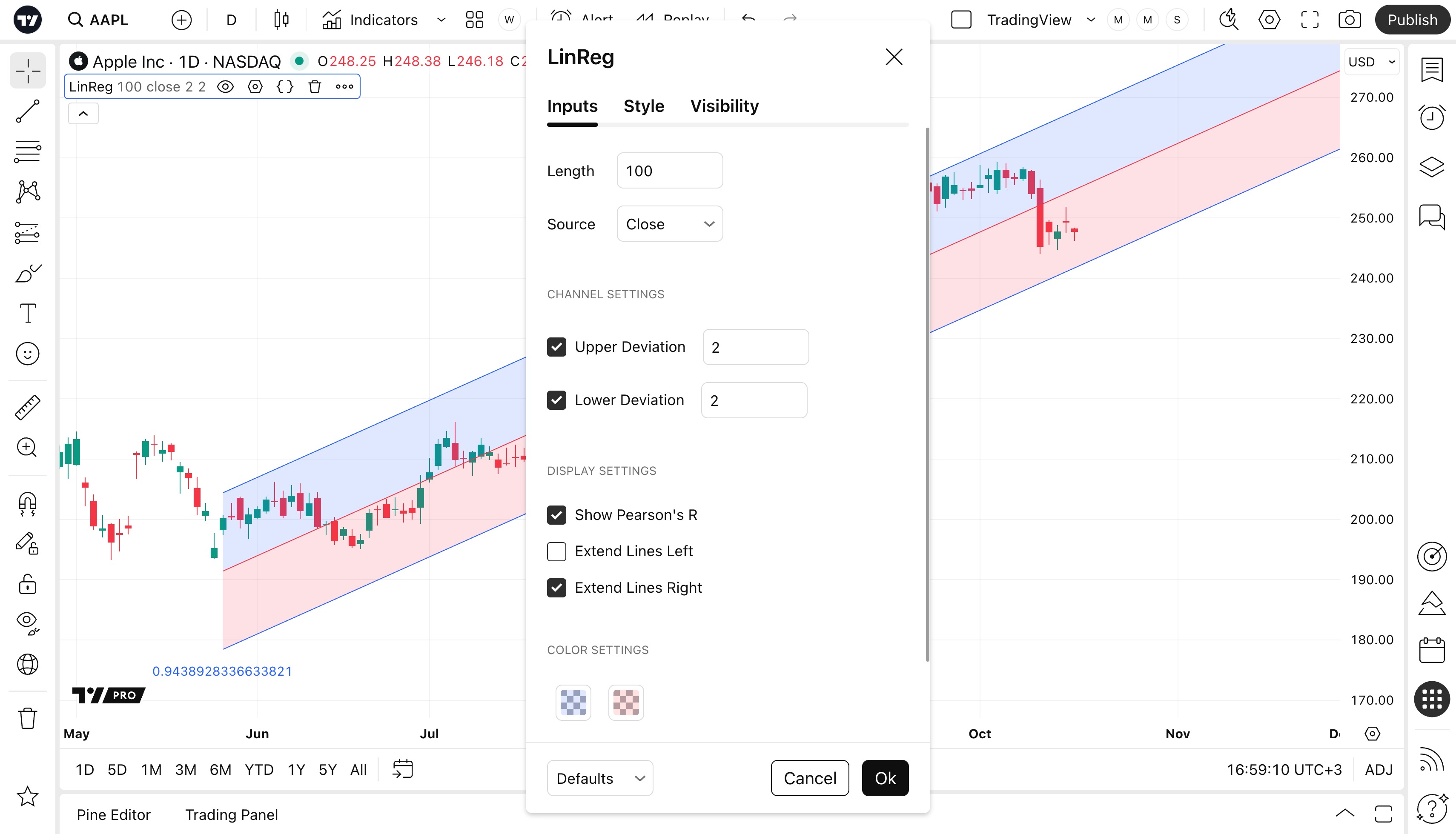 선형 회귀 지표는 선형 회귀 계산을 기반으로 차트 특정 부분의 일반적인 가격 추세를 시각화합니다. 인디케이터의 중앙 선은 선형 회귀 계산 자체이며, 그 위 또는 아래의 선은 기본 선에서 표준 편차를 X만큼 제거한 것입니다. 가격이 기준선에서 비정상적으로 멀어진 시점을 판단할 때 사용하면 좋은 도구입니다.
