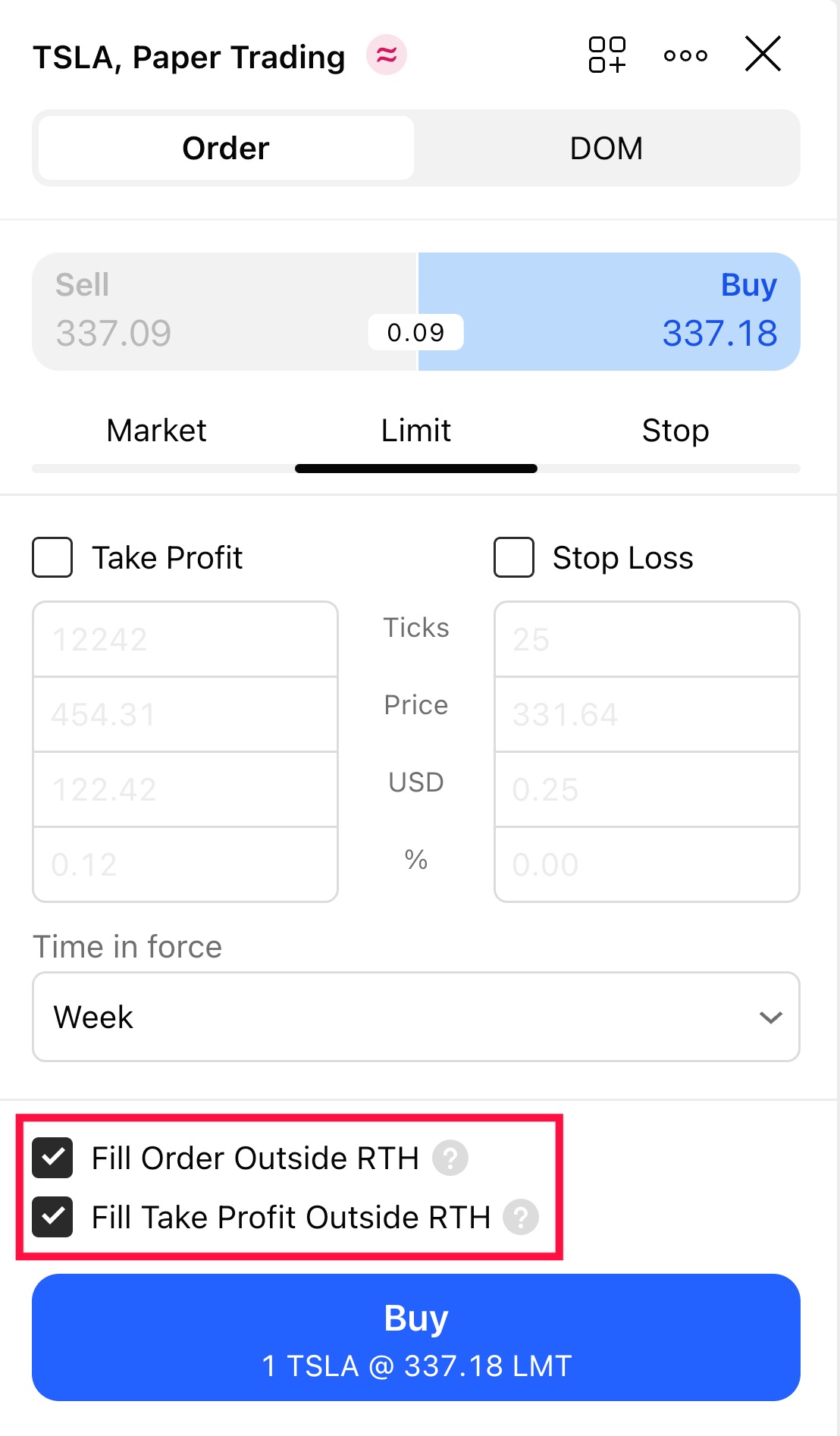 - RTH 외부에서 이익실현 주문 체결 - 연장 시간 동안 이익실현 주문을 체결할 수 있습니다.