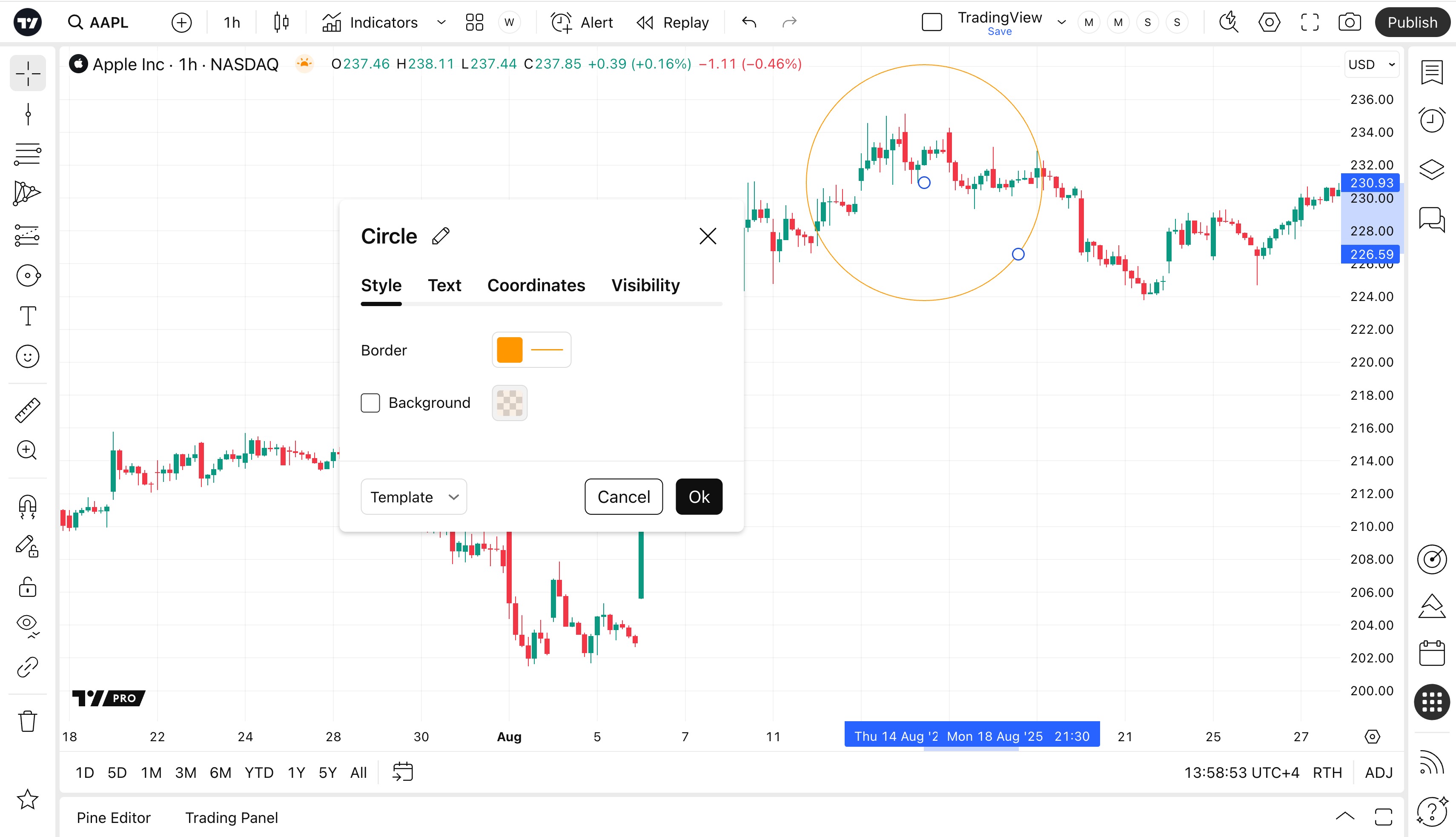 써클은 보통 차트에 주요 영역을 마크하는데 쓰입니다. 보기로, 프라이스 스파이크, 피크 또는 과매수/과매도 영역 등.