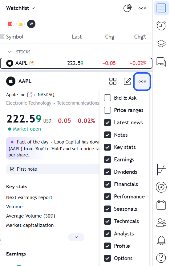 디테일 섹션을 커스터마이즈하는 법여러분이 심볼 디테일 (디테일) 컨텐츠를 커스터마이즈하고 싶다면 세팅 버튼을 클릭한 뒤 님의 모든 디바이스에서 보고자 하는 정보들을 고르면 됩니다.더 오래된더 오래된왓치리스트의 체인지 및 체인지 % 셈은 어떻게 하나요?다음다음텍스트 메모를 만드는 방법슈퍼차트 시작
