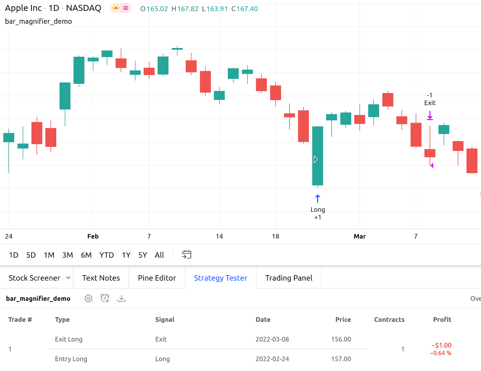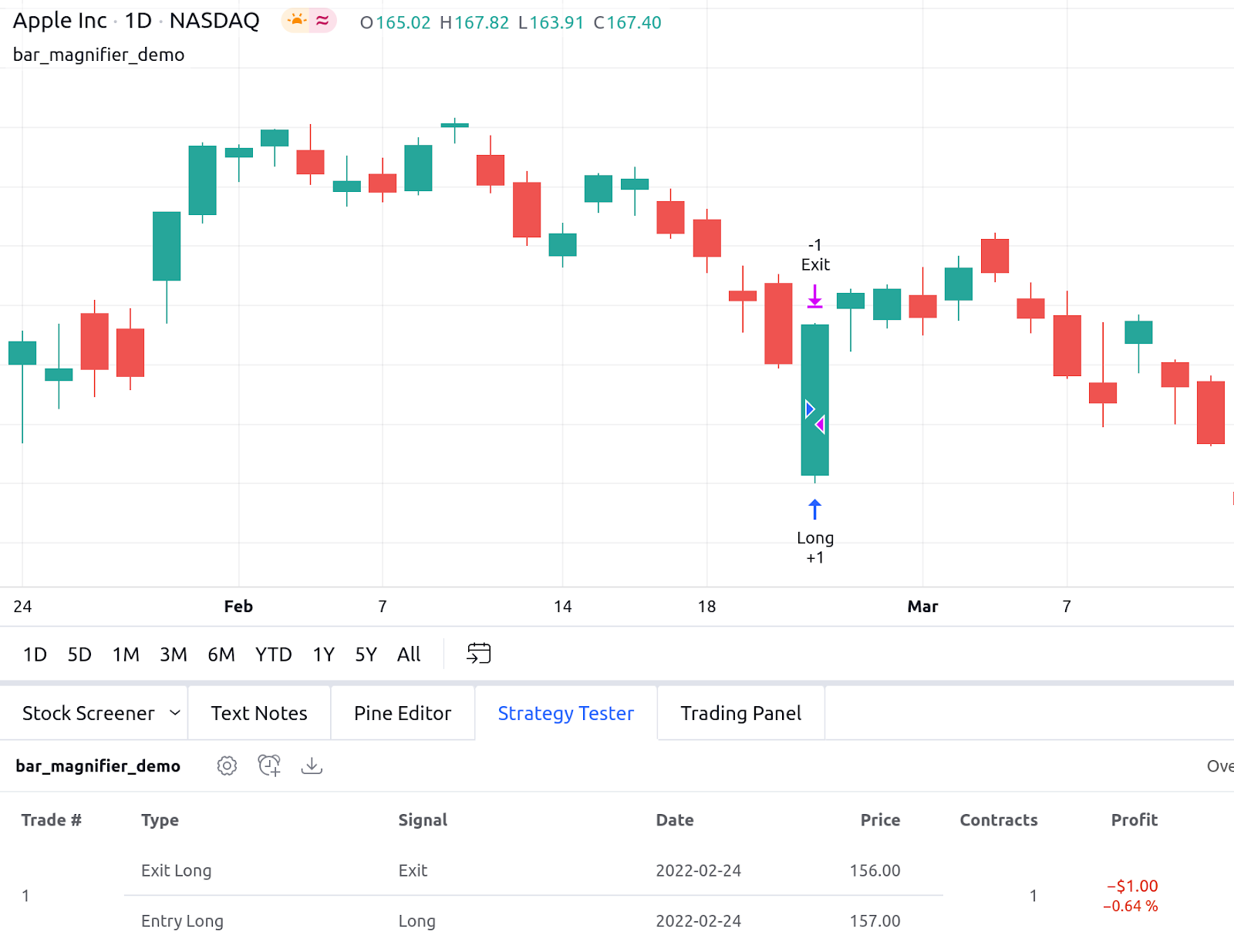 If we check the lower chart interval for the same symbol (a 60-minute chart, according to the intrabar interval table) and find the time range corresponding to bar 10,382, we can see that on the hourly interval, after reaching 157.0 and triggering the entry, the price goes down below 156.0, satisfying the stop = 156.0 condition.