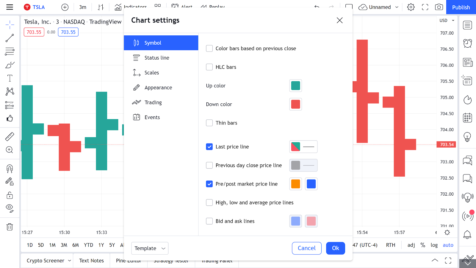 씬 바 모드에서는 오픈 및 클로즈 프라이스 표시가 해당 레벨에 정확히 그려집니다. 씬 바 모드가 꺼지면 작은 가로 라인이 여러 프라이스 레벨을 크로스할 수 있습니다.
