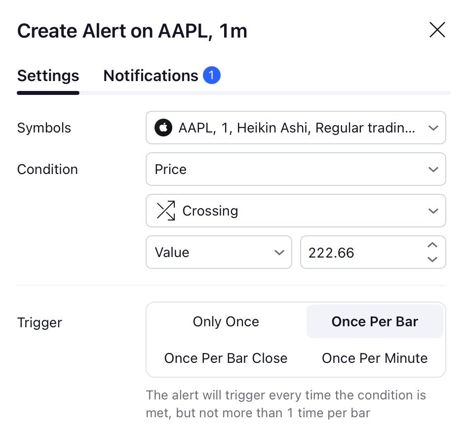 프라이스 값은 모든 간격에서 동일하며 이러한 알림은 간격에 관계없이 트리거됩니다. 간격에 따른 얼러트를 설정하려는 경우 수평선 얼러트를 만들 수 있습니다.